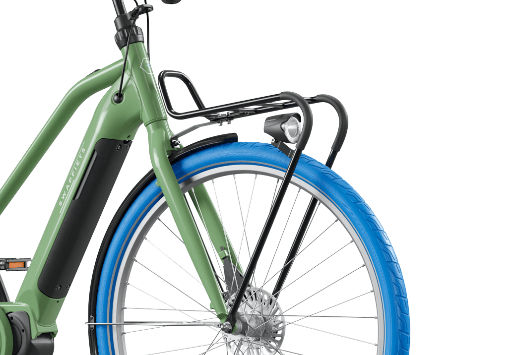 Charakteristischer blauer Reifen - rutschfest und pannensicher.