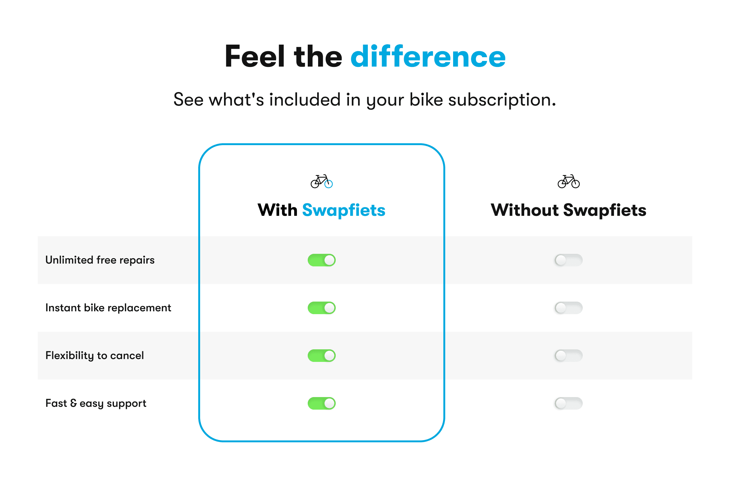 We know it sounds almost too good to be true, but we’re not afraid to prove it. Don't just take our word for it. Book a free test ride at your nearest Swapfiets store or subscribe.